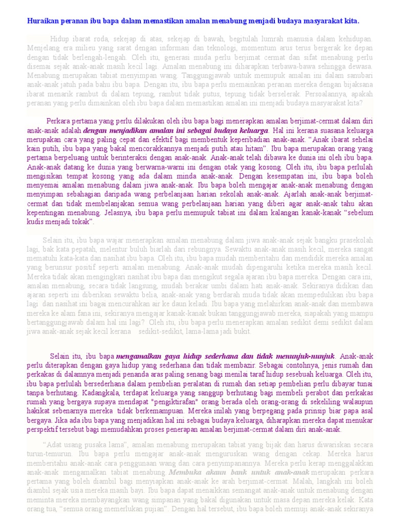 Peranan Ibu Bapa Dalam Memupuk Amalan Membaca Dalam Kalangan Anak Cute766 from i0.wp.com Amalan menabung haruslah dipupuk sejak kecil lagi bak kata pepatah melentur buluh biarlah dari rebungnya. Menabung amat penting untuk menjamin kehidupan pada masa hadapan. Menjelang era milieu yang sarat dengan informasi dan teknologi, momentum arus terus bergerak ke depan dengan tidak berlengah lengah. Bidang sukan merupakan salah satu bidang yang penting di negara kita selain bidang pelancongan dan perindustrian. Peranan ibu bapa dalam memupuk semangat membaca dalam kalangan remaja. Pada zaman pascaglobalisasi ini, menyimpan wang tabungan di bank merupakan prakarsa yang efektif untuk memastikan wang. Berikan pendapat anda tentang peranan keluarga dalam memupuk amalan berjimat cermat. Huraikan peranan ibu bapa dalam memastikan amalan menabung menjadi budaya masyarakat kita.