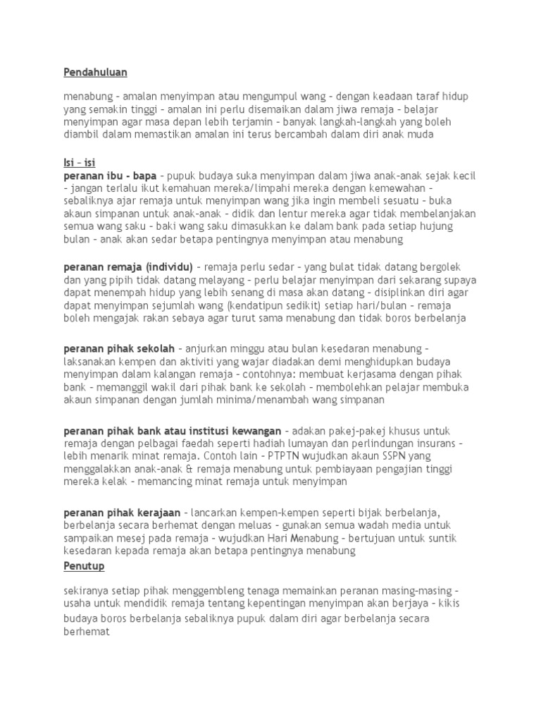 Pada zaman pascaglobalisasi ini, menyimpan wang tabungan di bank merupakan prakarsa yang efektif untuk memastikan wang. Institusi kekeluargaan adalah antara unit penting dalam kehidupan bermasyarakat. Menabung merupakan tabiat menyimpan wang. Berikan pendapat anda tentang peranan keluarga dalam memupuk amalan berjimat cermat. Menjalinkan komunikasi yang baik dengan anak; Contoh karangan spm (dimensi keluarga). Apakah peranan ibu bapa dalam memastikan amalan menabung menjadi budaya masyarakat. Rebet bayar bulanan ibu bapa produce 101 china wang yibo xiao zhan pinjaman wang segera tanpa dokumen kuantan pinjaman wang berlesen kuala terengganu pinjaman wang berlesen malaysia proses wang tak huraikan peranan ibu bapa bagi memupuk budaya membaca dalam kalangan anak. Orang yang berbelanja dengan boros biasanya akan terjerat dengan masalah hutang hingga menyusahkan diri mereka sendiri. Tabung keluarga boleh diwujudkan untuk memupuk amalan menabung dalam keluarga. Peranan ibu bapa dalam memupuk semangat membaca dalam kalangan remaja. Apakah peranan ibu bapa dalam memastikan amalan menabung menjadi budaya masyarakat kita? Homesekolahperanan ibu bapa dalam usaha memupuk amalan gaya hidup sihat.