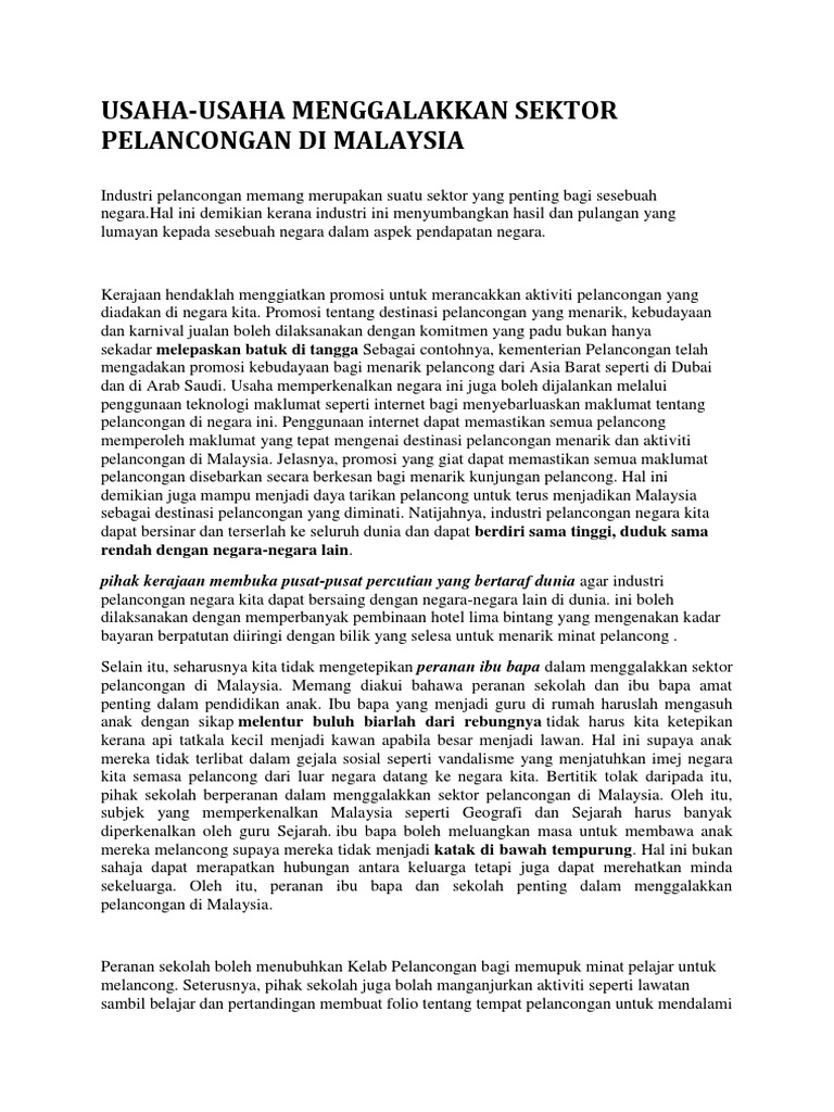 Contoh karangan peribahasa terbaik bahasa melayu. Sektor pelancongan dapat memajukan bidang perniagaan di malaysia. .malaysia merupakan salah satu destinasi pelancongan utama di dunia. Salah satu potensi bidang pelancongan di malaysia ialah pelancongan berasaskan warisan. Bidang ini bukan suatu perkara yang baru tetapi promosi terhadap aspek pelancongan warisan ini masih kurang. Kita juga sudah mengenal pasti negara zon hijau berpandukan rakyat malaysia sangat positif. Tetapi ekosistem juga telah membantu membentuk keyakinan. Dalam kertas kerja ini juga saya akan menyenaraikan beberapa insentif cukai yang memberi kesan kepada sektor pelancongan di malaysia. Sehingga kini, sektor pelancongan merupakan sektor kelima terbesar negara selepas sektor perkhidmatan kewangan, kelapa sawit, borong dan runcit, gas dan tenaga. Sedasawarsa ini, malaysia semakin dikenali sebagai lokasi pelancongan pilihan warga asing terutamanya daripada negara beriklim sejuk. Perubahan dalam business landscape akan membawa kepada normal baharu dalam perniagaan. Menteri pelancongan, seni dan budaya datuk seri nancy shukri berkata, ia berikutan disiplin tinggi rakyat malaysia yang mematuhi prosedur. Sektor pelancongan telah mengambil peranan yang lebih besar dalam merangsangkan ekonomi dalam tempoh rancangan malaysia kelapan.