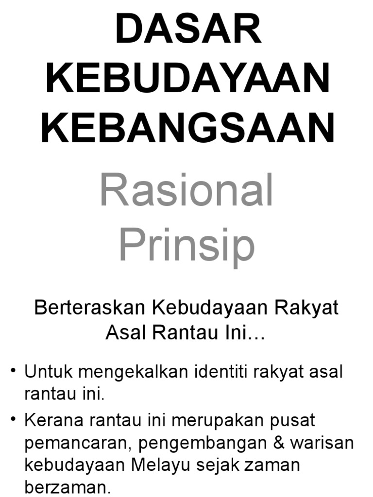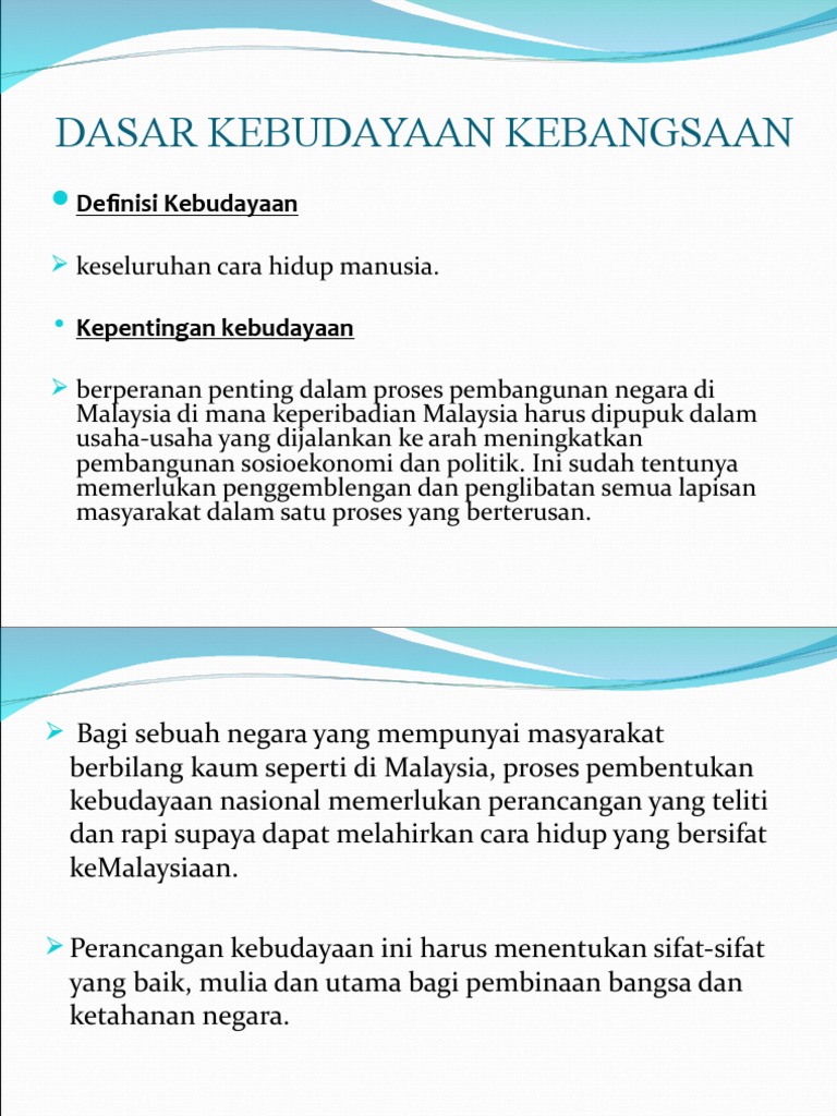 SIDANG MEJA BULAT : "DASAR KEBUDAYAAN KEBANGSAAN 1971 ... from belia.org.my Kebudayaan merupakan keseluruhan cara hidup manusia. I) kebudayaan kebangsaan malaysia hendaklah berteraskan kebudayaan rakyat asal rantau ini; It appears to be limited in economic utility and, more importantly, in flat contradiction of the 1malaysia concept. Berteraskan kebudayaan rakyat asal rantau melayu sebagai tunjang dasar kebudayaan kebangsaan. 3 prinsio utama dasar kebudayaan kebangsaan kebudayaan rakyat asal rantau melayu sebagai tunjang. Unsur kebudayaan lain yang sesuai dan wajar diterima. Zaid ahmad (2006) menyatakan bahawa perpaduan kaum merupakan penyatuan masyarakat pelbagai kaum yang. Yang layak dipentaskan mengikut dasar kebudayaan kebangsaan.